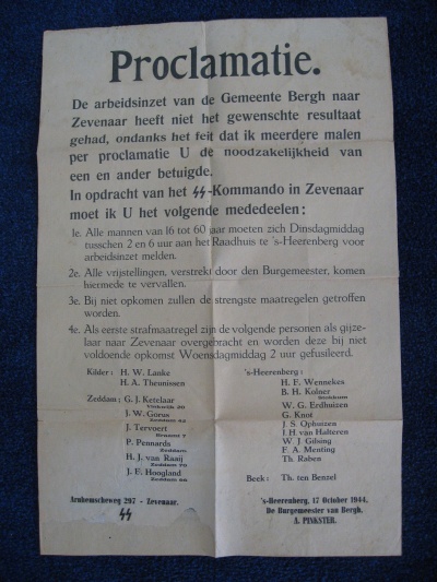 Mannen uit Bergh moesten vanaf oktober 1944 OT-werk doen in de omgeving van Zevenaar. Per omroepwagen en via aanplakbiljetten werden zij door de SS opgeroepen zich te melden. De opkomst was echter te gering, ook toen de leeftijdsgroep werd opgerekt van 15-50 jaar naar 15-60 jaar. Als tegenmaatregel heeft de SS toen een aantal mannen in gijzeling genomen. Hun gijzelname en hun namen werden per aanplakbiljet bekend gemaakt. Hierop meldden zich wel genoeg werkers aan. Later is de organisatie van het OT-werk overgegaan van de SS naar de gemeente, zodat ieder in zijn eigen woonplaats kon blijven.