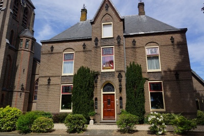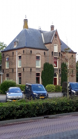 Pastorie en kerk zijn allebei in 1886 gebouwd naar een ontwerp van de architect A. Tepe. De middenas van de voorgevel springt iets naar voren en steekt met een geveltop door de dakrand. Horizontale banden in siermetselwerk en grote ankers sieren de gevels.