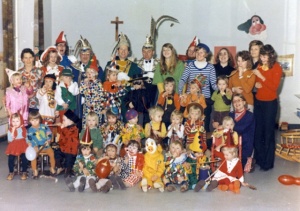 Foto peuterspeelzaal in Don Rua tijdens Carnaval 1974. Prins Bernard I (Bernard Dijkman), links naast hem adjudant Piet van der Vossen. Onderste rij: 3e van links: Anton Welling jr. 5e van links: Dirk Hövelman.