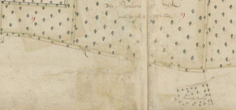 De kaart die Bücker tekende is "ondersteboven": de onderkant is het noorden en de bovenkant is het zuiden. Onderstaande kaartuitsnede moet in gedachten dus omgedraaid worden. Behalve de naam Princesse Busken zijn te lezen Die Verckens Straitt en Die Verckens Weijde. In het noordelijke deel van de Plantage werden destijds blijkbaar varkens geweid. De hele weg van 's-Heerenberg naar Stokkum heette toen Varkenstraatje, maar tegenwoordig is er alleen even buiten Stokkum nog een weg die zo heet. Vanaf 's-Heerenberg heet de weg nu eerst De Gaarde en daarna Nachtegaalslaantje.
