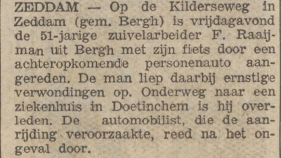Nevenstaand artikel uit Trouw van dinsdag 2 januari 1968 doet verslag van het ongeluk dat op 29 december 1967 was gebeurd op de Kilderseweg in Zeddam. Aan zijn daarbij opgelopen verwondingen is hij die dag overleden, 51 jaar oud, en werd begraven op de r.-k. begraafplaats in Zeddam. Zijn weduwe Bernardina Wilhelmina Hermsen overleed op 5 juli 1988, 67 jaar oud, en werd bij hem begraven. Hun graven zijn inmiddels geruimd.