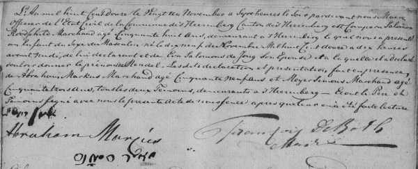 Als getuigen waren meegekomen Abraham Marcus en Meijer Simons. Bij de handtekeningen onder de geboorteakte valt op dat die van Abraham Marcus in Latijns schrift is geschreven, maar die van Meijer Simons in Hebreeuws schrift: מאייר סימונס. Pleegde Meijer met zijn handtekening een verzetsdaad tegen de Franse overheersing? De handtekening van vader Salomon is zo'n hanepoot dat het zowel Latijns als Hebreeuws schrift kan zijn.