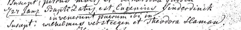 Pastoor Beenen noteerde in het doopboek geen verklaring voor de keuze van de voornaam Eugenius, maar wel voor die van de achternaam: invenerunt puerum ibi, Latijn voor "zij vonden de jongen daar". Worden met "zij" de peetouders Willem Verstegen en zijn vrouw Theodora Slaaman bedoeld, zodat zij het kind gevonden hebben? Hoe dan ook is het kind niet naar hen vernoemd. Willem Verstegen was tapper aan de Zinderdijk.