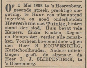 Advertentie van Sliepenbeek voor de verhuur van een pand dat hij in 's-Heerenberg bezat. Uit Het Nieuws van den Dag van 12 april 1892