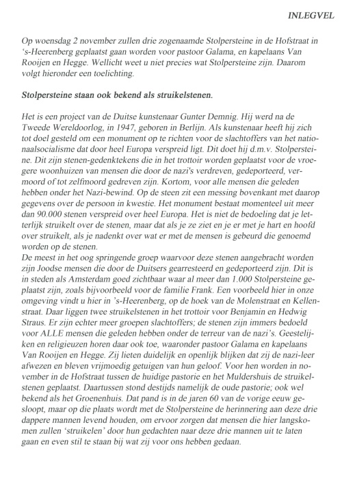 Op 2 november 2022 zijn in de Hofstraat ter hoogte van het voormalige Groenenhuis drie Stolpersteine geplaatst. Ze gedenken pastoor Galama en zijn kapelaans Van Rooijen en Hegge, die in de Tweede Wereldoorlog in verzet kwamen tegen de bezetters. Zij werden gearresteerd en alleen kapelaan Hegge overleefde de oorlog.