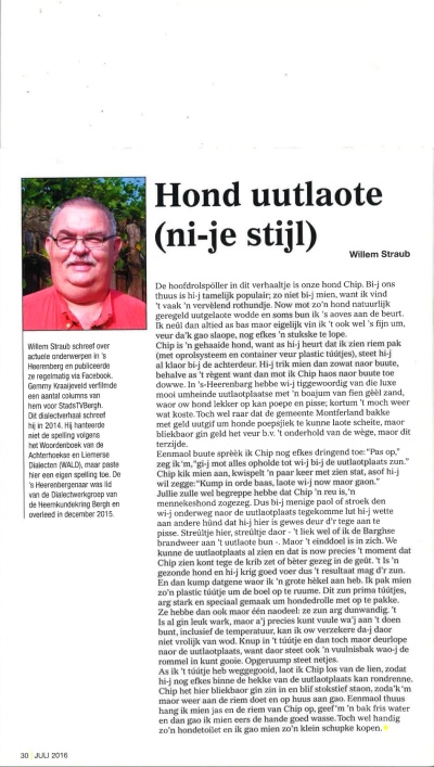 Willems verhaal Hond uutlaote werd gepubliceerd op blz. 30 van Old Ni-js nr. 94 en verfilmd door Stads TV Bergh. Het is te zien via deze link.