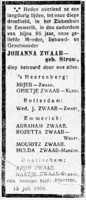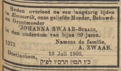 Zij overleed in Emmerik op 19 juli 1906, 88 jaar oud. Zij werd begraven op de Joodse begraafplaats in 's-Heerenberg, waar haar grafsteen nog steeds aanwezig is.