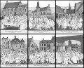 4. De vreemdelingen herbergen op het plein van het Oude Gasthuis aan de Kellenstraat. 5. De zieken verzorgen bij de buitenste poort van Huis Bergh met de Boetselaersborg op de achtergrond. 7. De doden begraven met de Munt op de achtergrond.