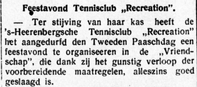 Wegens het vertrek van een groot aantal vooraanstaande leden werd Tennisvereeniging Recreation in april 1939 opgeheven.