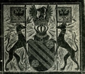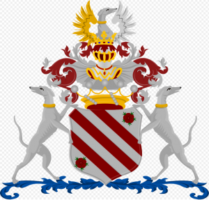 - De schildhouders: twee klimmende zilveren hazewindhonden met een gouden halsband, houdende een gouden toernooilans met banieren. Op de banieren is een tweekoppige adelaar afgebeeld.