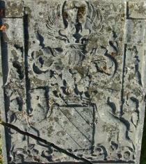 Opvallend is nog dat in de afgebeelde gedenksteen en gevelsteen de helm direct op het schild rust, terwijl er op de grafsteen en in de tekeningen een erfridderkroon tussen deze twee pronkstukken is aangebracht. De kroon op de helm is daarentegen een gravenkroon.