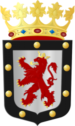 In zilver een leeuw van keel, getongd, genageld en gekroond van goud, en een schildzoom van sabel, beladen met negen bollen van goud. Het schild gedekt met een gouden kroon van vijf bladeren