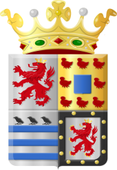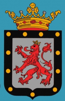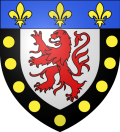 In zilver een leeuw van keel, getongd, genageld en gekroond van goud, en een schildzoom van sabel, beladen met negen bollen van goud.