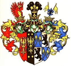 Het wapen bestaat uit drie delen. In de afbeelding hiernaast is elk deel gedekt met een helm met een uitbundig vorm gegeven dekkleed, een rangkroon en een helmteken.