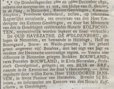 De erven droegen de havezate in 1822 over aan Theodorus Janssen, die van 1806 tot 1814 pastoor was geweest in 's-Heerenberg en sindsdien in Netterden stond. Na pastoor Janssens dood in 1830 werd de Woldenburg geveild door notaris Kolfschoten uit Gendringen. De koper was Cornelis Kroes, rentenier en eigenaar van meerdere panden en percelen in Netterden. Toen de resterende ruime woning in 1933 afbrandde, woonde Johannes Cornelis Grin er met zijn gezin.