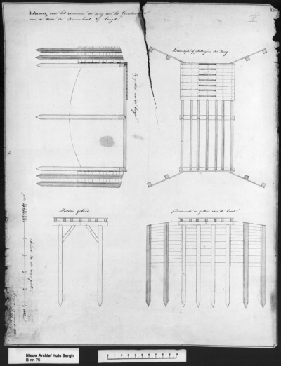 De tekening is uitgevoerd in schaal 1:40 met als lengtemaat de el. Te Wiel tekende een bovenaanzicht en doorsneden door de lengte en de breedte. Rechtsonder staat bovendien een Doorsnede en opstand over de breete. Opstand is hier een bouwkundige term voor een tekening die een constructie weergeeft zoals die zich aan het oog toont. In dit geval is het de houten wand die op zowel de Nederlandse als de Duitse oever werd gebouwd. Links en rechts boog die wand achterwaarts. De brug rustte op deze wanden.